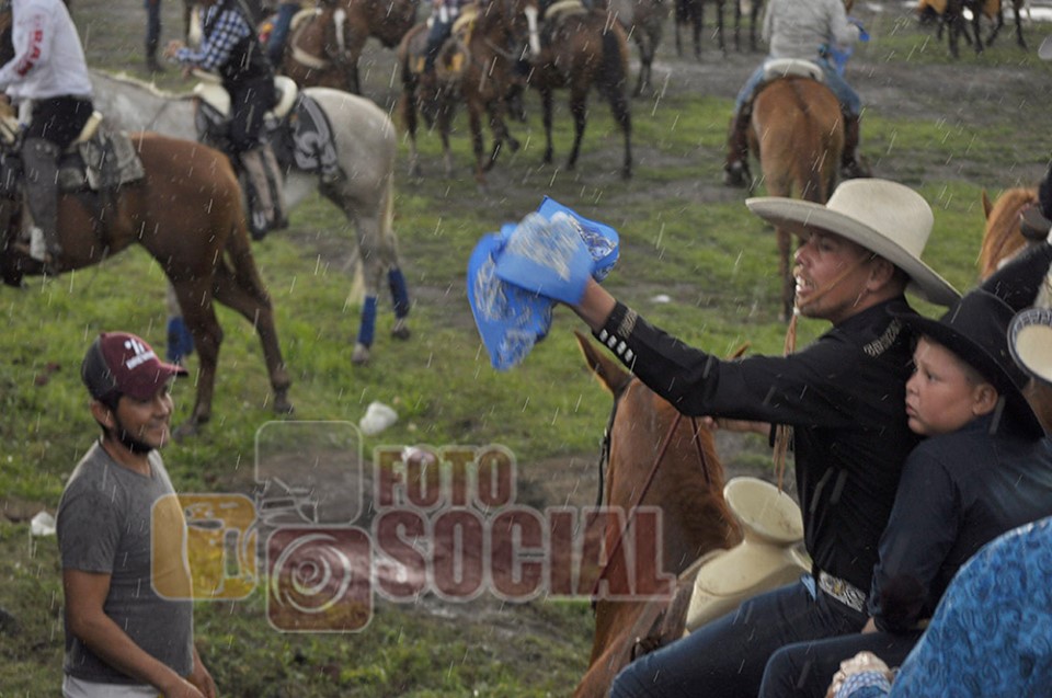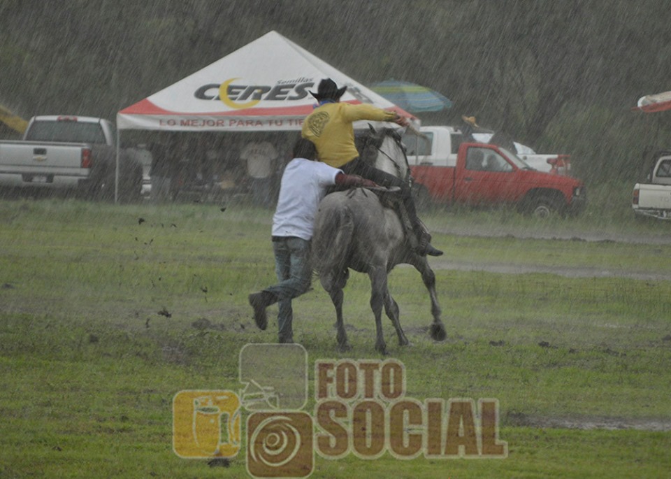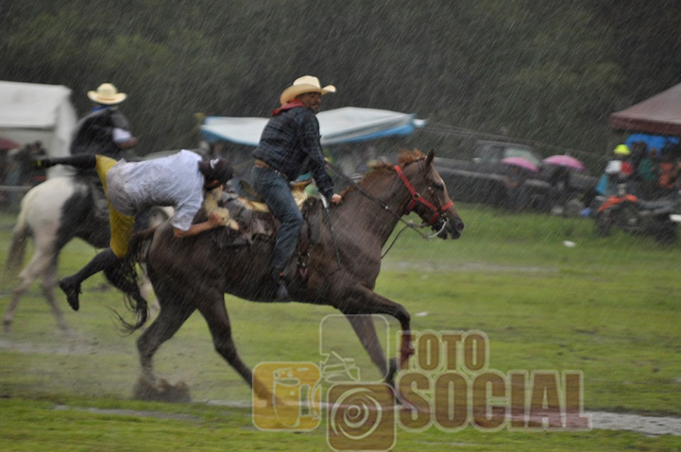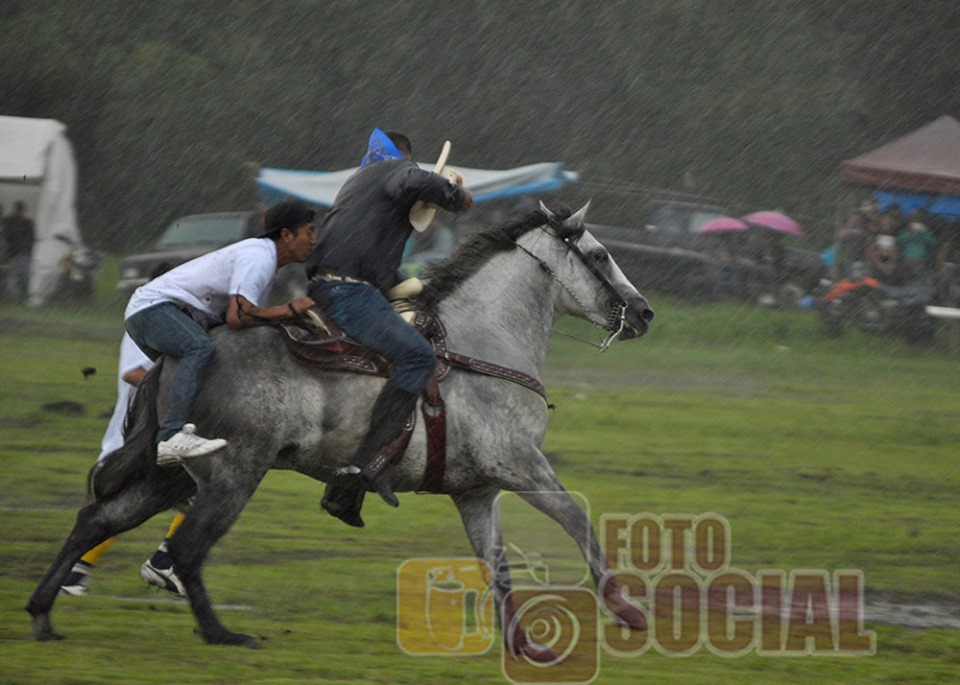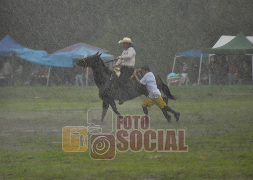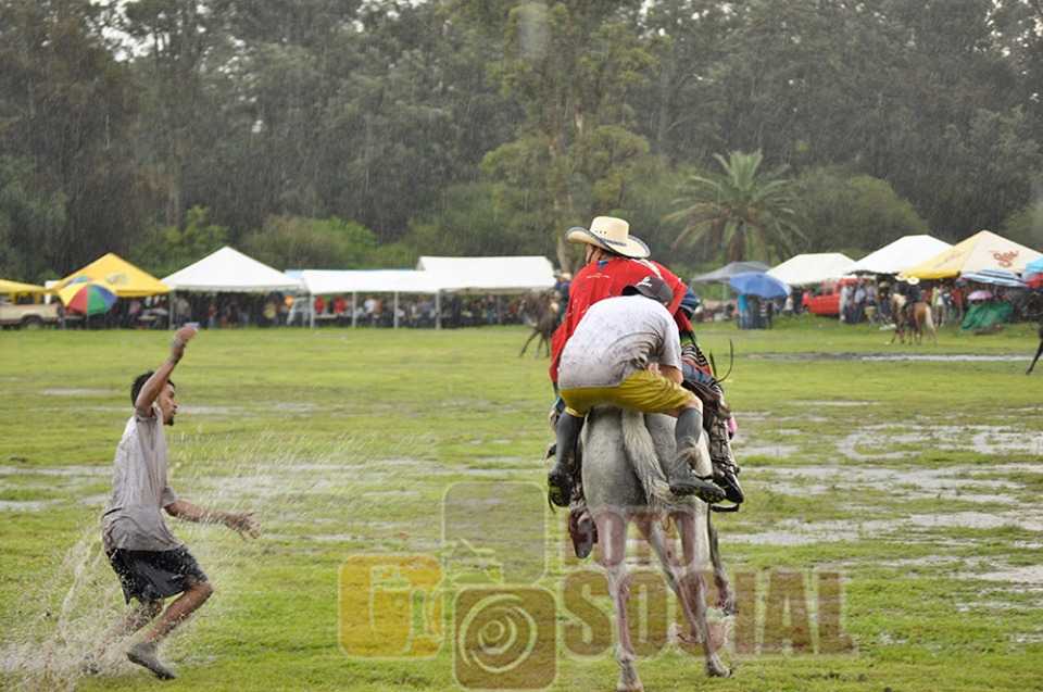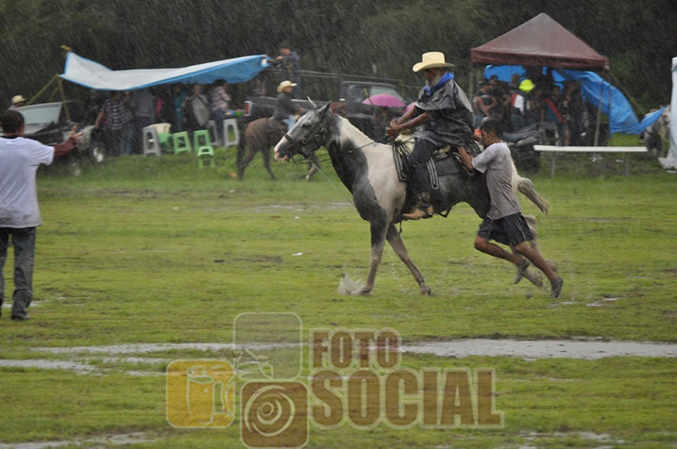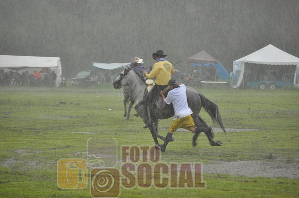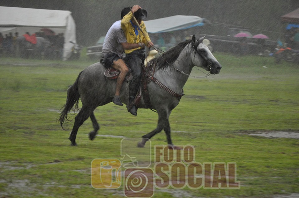 Empezando el juego empezó a caer una muy buena tormenta que no desanimo ni a los jinetes ni a los arrieros y con algo más de peligro por lo resbaloso de la cancha, comenzó el juego que consiste en atrapar a los caballerangos, que son los bandidos, y el agua no paró.