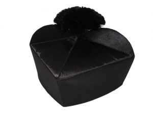 Completando la alusión eclesiástica, algunos trajes incluyen un bonete en la cabeza –que puede ser un gorro negro de cuatro picos como el usado por el clero, o en ciertos diseños un sombrero cónico alto–. Este elemento remata la caracterización clerical de la vestimenta.